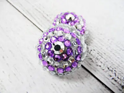 These no doubt take some patience to create but they are really very simple to design. You will need a 1-2 inch foam ball cut in half, sticky back rhinestones or pearl embellishments, string ribbon pearls or rhinestone ribbons work great as well, plus a glue gun.  Above is my poppy center design with a jewel center.Â