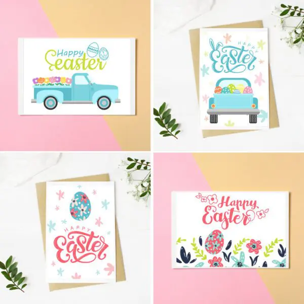 Save a little extra with these four free printable cards for easter. The whimsical colors and designs make these beautiful to give in spring. Use a medium to heavy-weight cardstock for best results.
