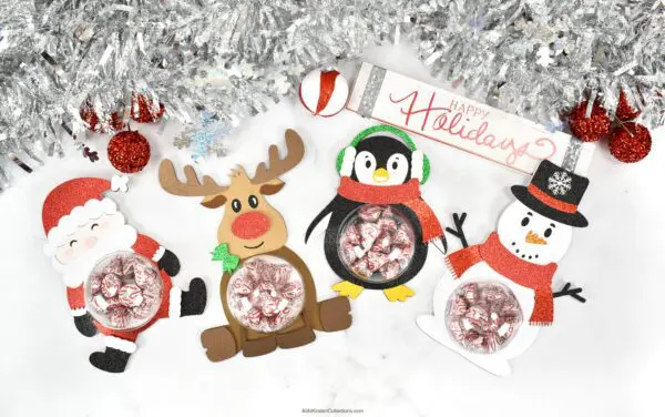 Are you ready to make an easy and cute DIY Christmas craft perfect for handing out as gifts this holiday season? I created some puppy dog candy holders a while ago and Easter-themed candy crafts. But I wanted to create some Christmas candy holders that are just for the holidays! I made a Santa Claus, Penguin, Snowman, and Reindeer candy holder that you can make with the help of your Cricut machine! I also added an Elf candy holder template because I received a request from my community.