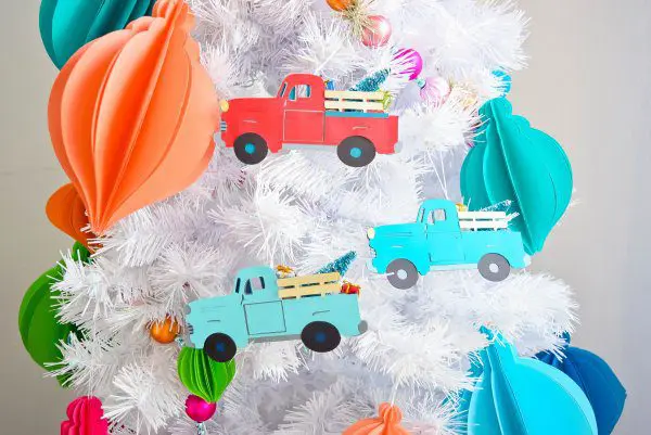 Everywhere I look, I see one of those cute vintage-style trucks with a Christmas tree sticking out of the back. They seem to be a beloved way to decorate, so I decided why not make a cute SVG design and turn the Christmas truck into an ornament for your tree. Get this free Christmas truck tree ornament SVG file.