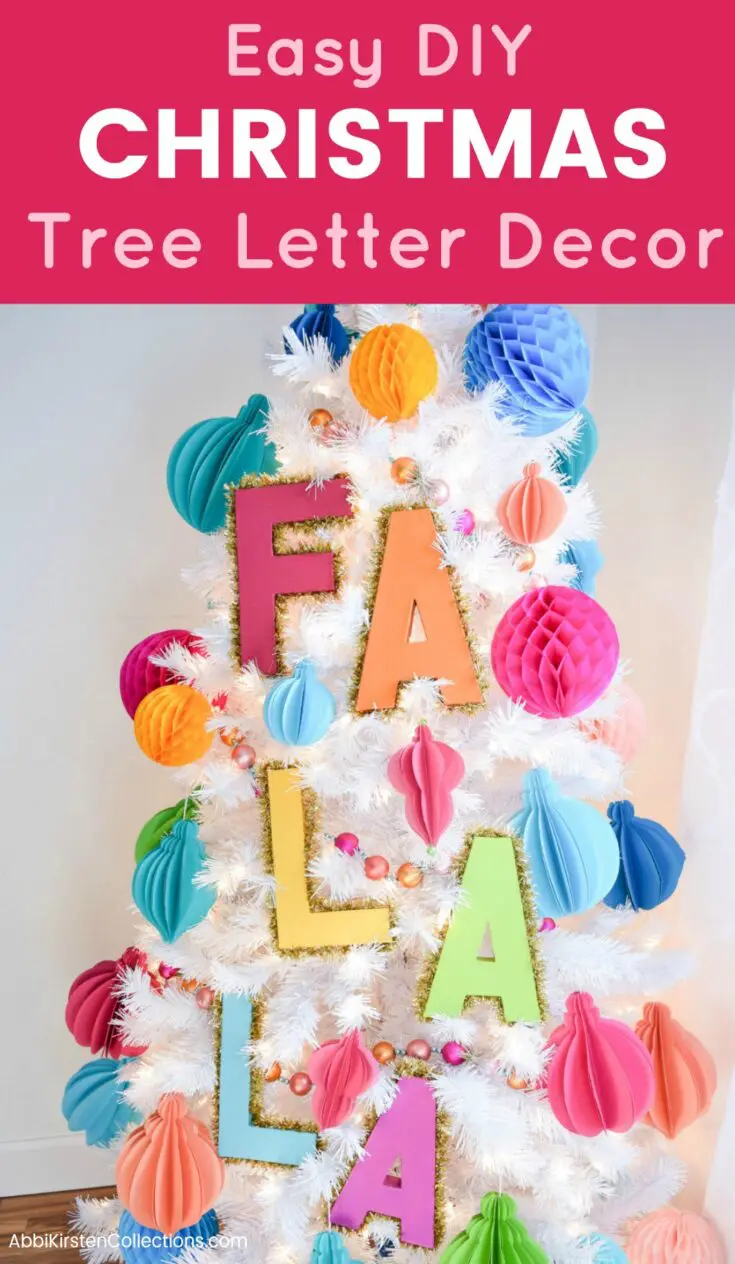 I made my large, vibrant paper ornaments this year for my white tree, then resolved it needed a little extra punch with some decorative tinsel Christmas tree letters. I decided to spell out a holiday phrase, Falala!