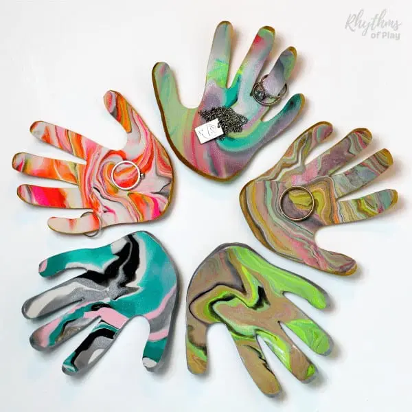 Continuing with the handprint theme from above, Rhythms of Play has created these fun DIY marbled clay handprint dishes as a great way for mom to store her rings and earrings.