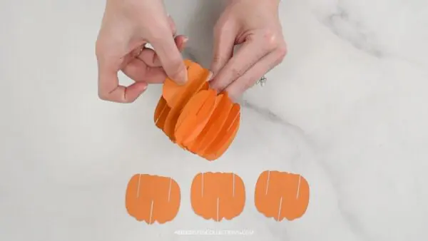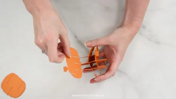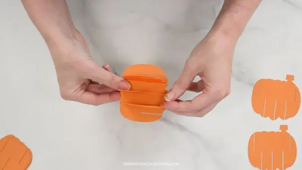 - At this point, the four smaller pumpkin cuts are remaining. Slide each one of those on all four sides of the pumpkin. You will need to slide the center together first, then tuck each end around the other so it interlocks. Again, watch the video for a complete close-up.