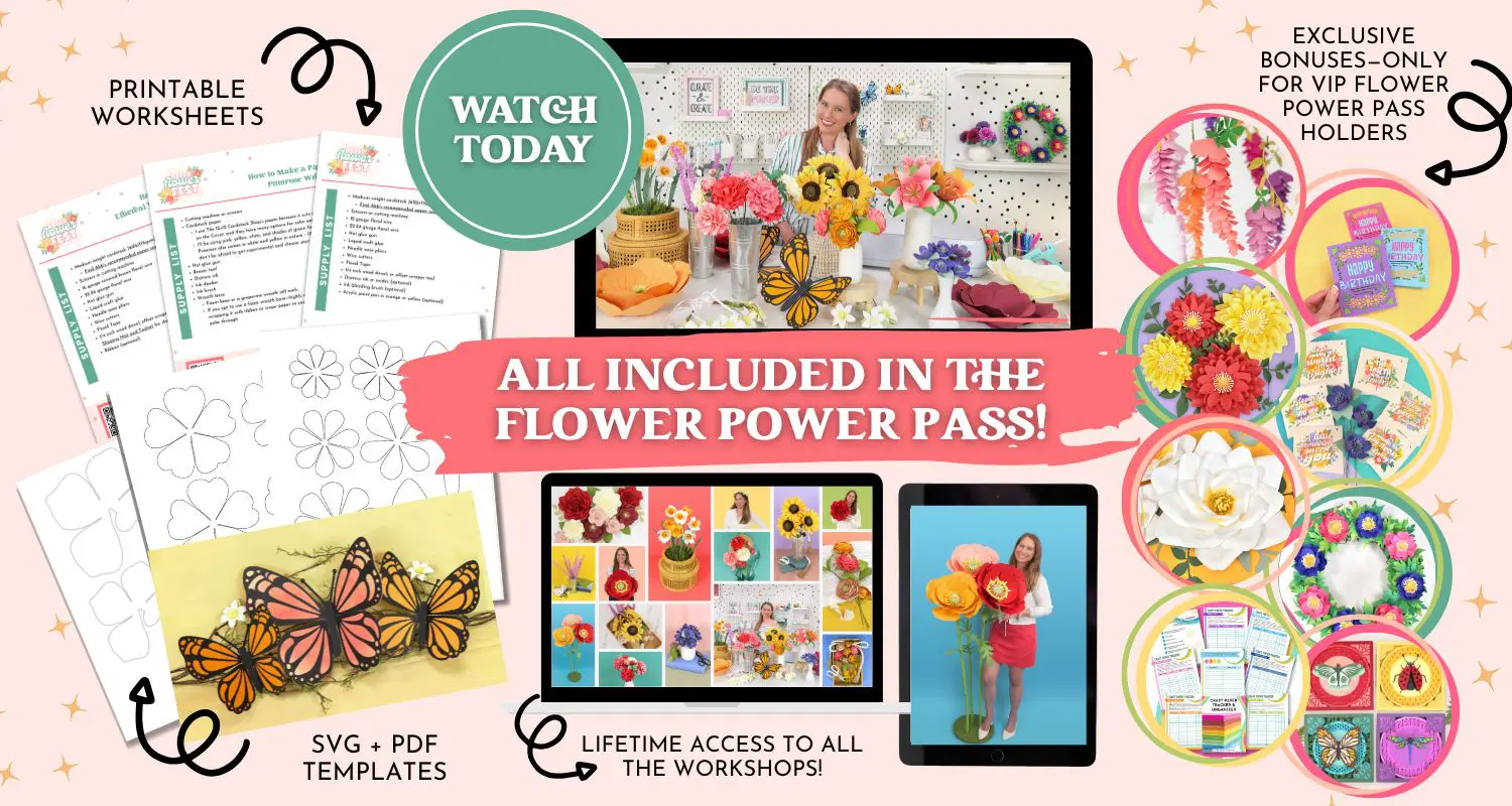 - Unlimited replays with paper flower templates (both SVG cut files and PDF printables) for 13 brand-new paper flower workshops (Value: $449+)