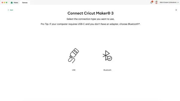 - Follow Cricut’s prompts on the screen until you reach the screen that asks if you want to connect to your Cricut with the USB cable included or via Bluetooth for wireless connection.