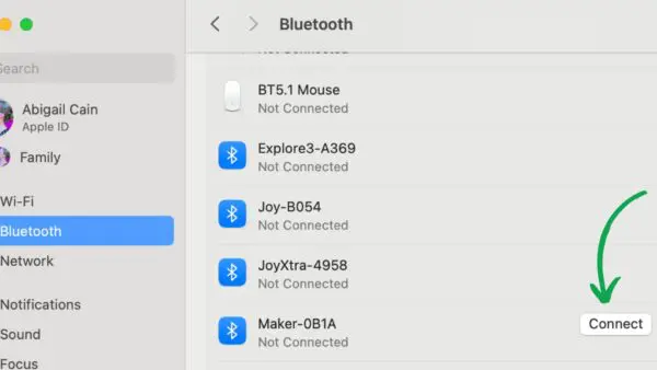Bluetooth Connection: If you opt for Bluetooth, open your computer settings with your Cricut powered on and nearby (15 ft or less). Then, select the machine model that will appear under Bluetooth > Devices and click Connect.