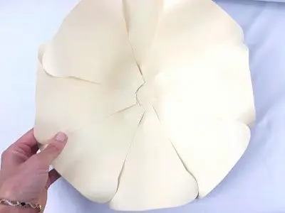 11. Now for your 4th small layer of petals you will cut slits and overlap like the other 3 layers, but with these 8 petals you will give a crease that the bottom as shown above. This is going to help them stand up better.Â