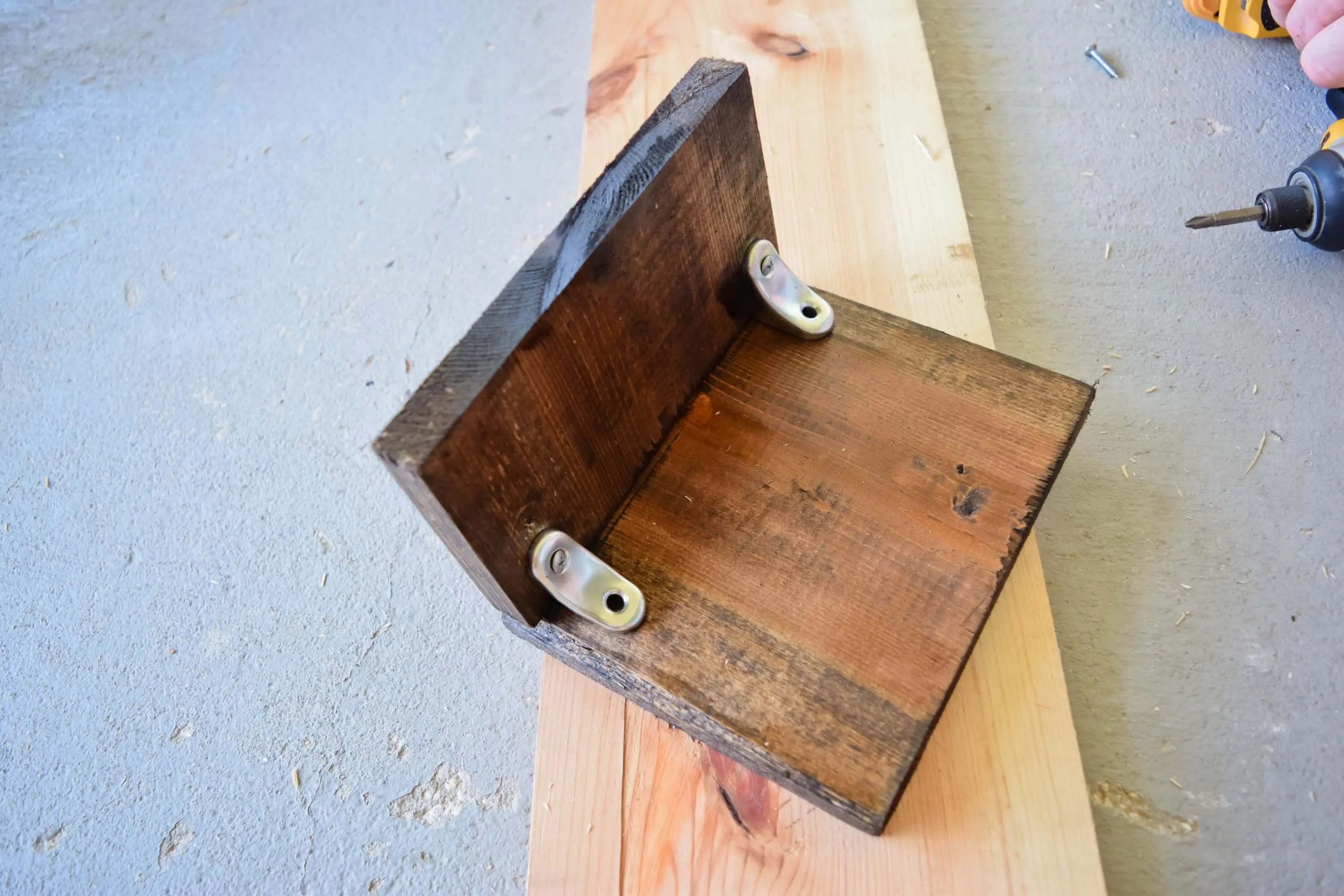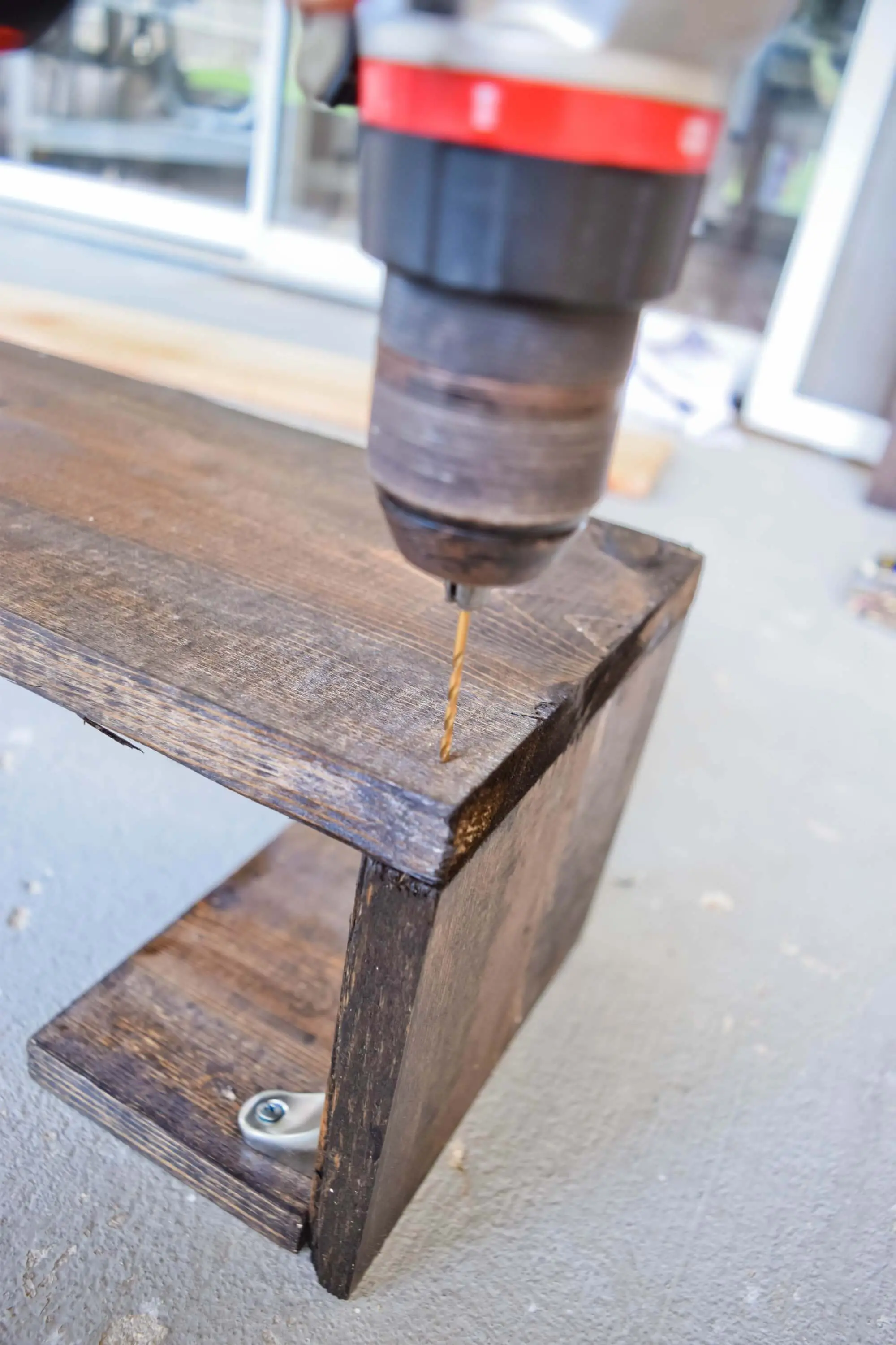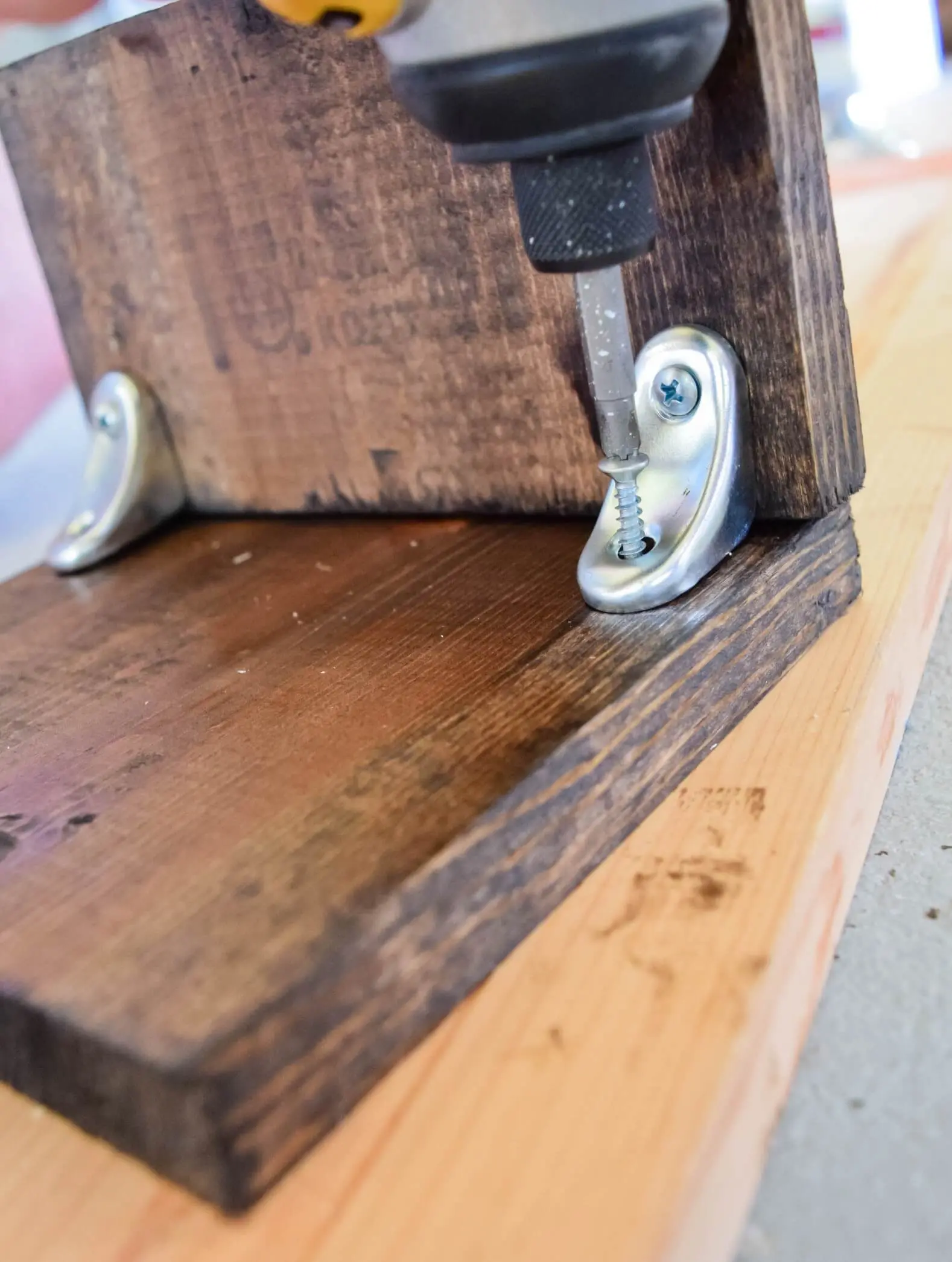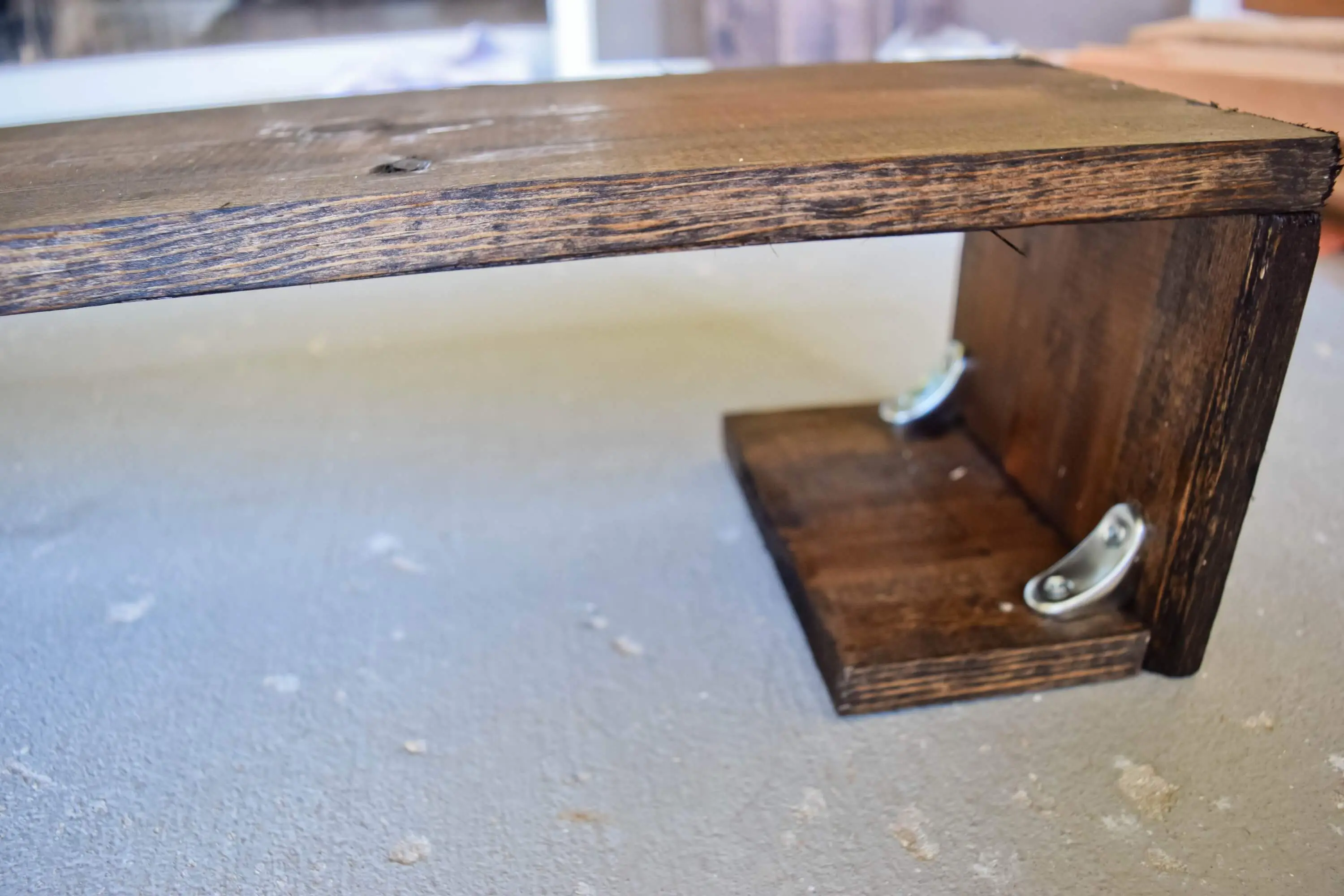 Side note: I personally like have a little peak-a-boo with the bronze screws on the front. If you don’t want to see these then you can cover the screws with a little wood putty, sand once dried and add a touch of your stain over it to cover them up.