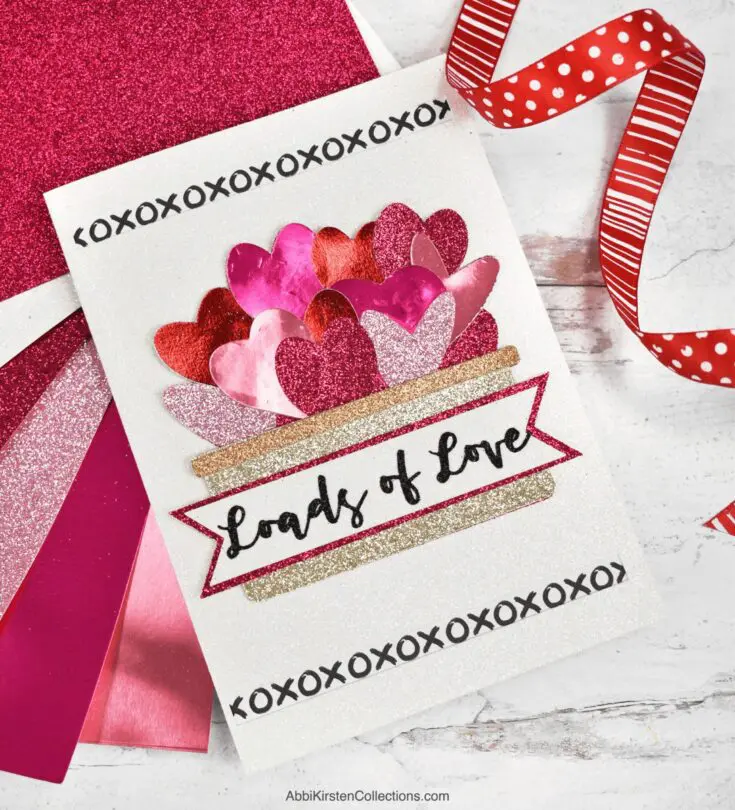 Who doesn’t want a lot of love this Valentine’s Day? You can deliver tons of adoration or romance to the most important people in your life with this handmade “Loads of Love” card! It’s an easy layered papercraft when you use a Cricut machine, and it takes very little time to make. The glitter cardstock really makes the heart-filled basket design pop!