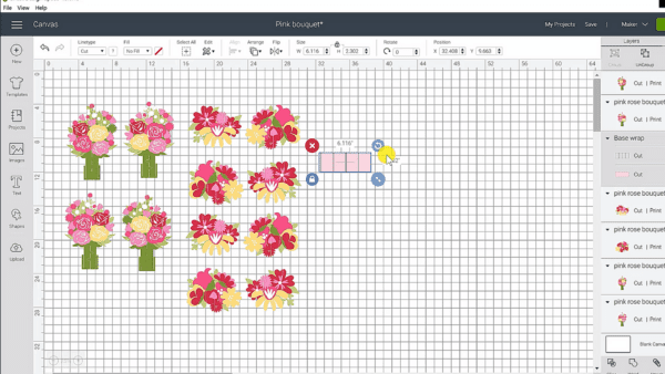 - Print the free PNG images of the bouquets out through Cricut Design Space. Need help understanding Print Then Cut read more here. Make sure to mirror duplicates of each piece. View the video tutorial for full setup details.