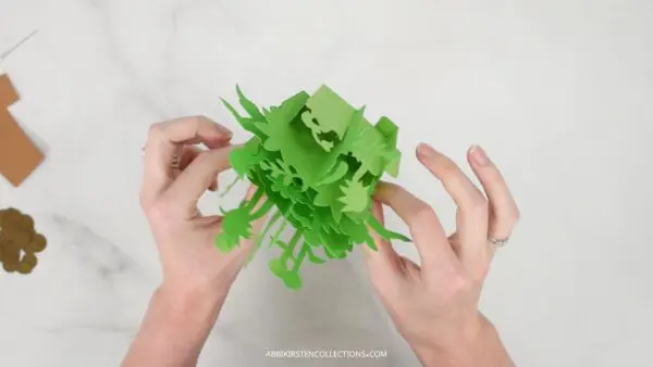 - Gather all your card layers and start by building the basket. Grab the two longest green pieces and fold them along the scorelines. Interlock each end of the two longest green pieces and fold the round tabs up.