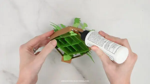 - Make sure the base tabs of the brown piece are folded out. Insert the green piece into the brown piece and make sure the two tab sets from the brown basket and green piece are overlapping at the bottom. Add glue between the two sets of tabs to hold the green and brown tabs together. See the video here for more help.