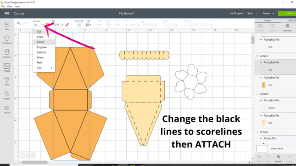 When you bring in the pie box templates, there will be solid black lines over the box, crust, and whip cream pieces. Each of these lines needs to be selected (after you have ungrouped at the top right side) and changed to score lines. Make sure you use your Attach button at the bottom of the layer’s panel to the right to hold the scorelines in place. Otherwise, when you go to the cut screen, the scorelines will shift on you.